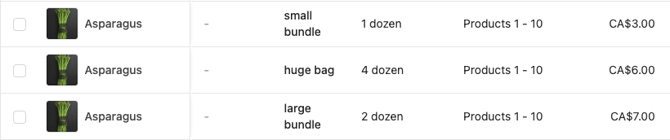 For the price sorting options, the system will use the price of the first package in the list of packages for that product that has been assigned to the price list. You can view the list of available packages in the Price List Products table, or in the Add Product to Price Lists section of the product edit page. In this example, the system would use the small bundle package price of $3.00 as the sort criteria.