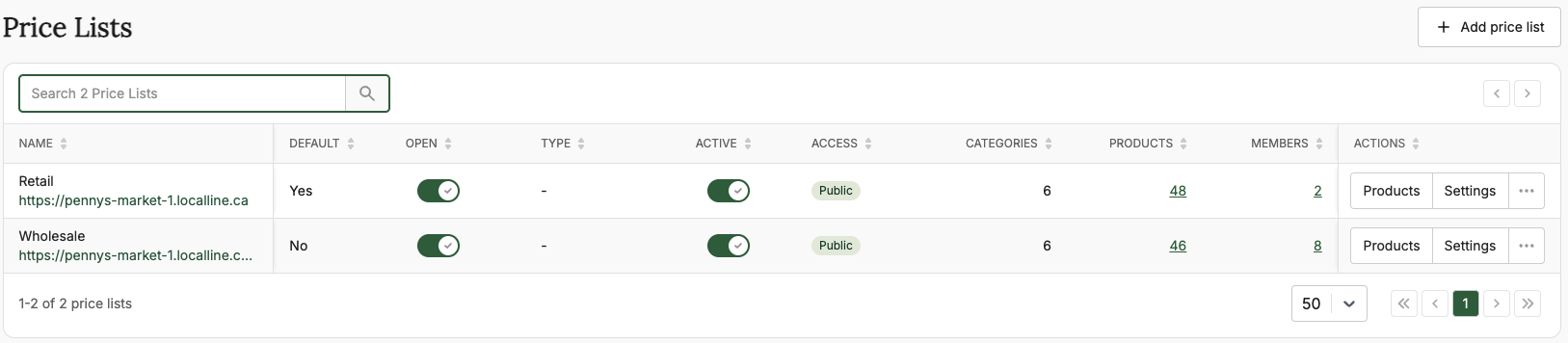 The Price Lists page is where you will add and manage your price lists for different sales channels, like retail or wholesale.