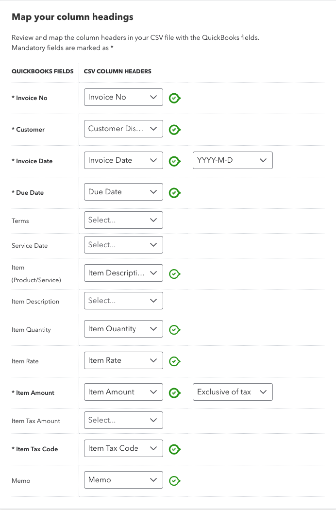 - In the next step you will map the columns from the export to fields in QuickBooks. For most of them, the column headers are the same as the fields names in QuickBooks to make things easy and some will be automatically selected, however you will need to manually adjust a few options: