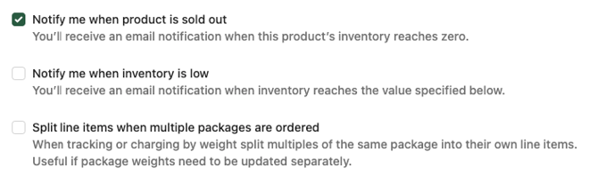 - Notify me when inventory is low: You can enable this option and specify a value greater than 0 to receive an email notification when you are running low on this product