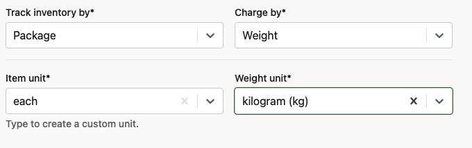 Note: While it is technically possible to track or charge by package, and then use a weight unit like pound or kilogram, this is generally not advised as it can lead to confusion on order exports. For packaged products it's recommend to use something like "each", and then when defining your packages you can indicate a more specific type of packaging like "tray", "bag" or "box".
