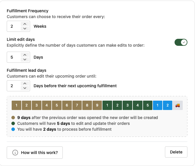 - If the fulfillment plan is edited, you will need to redefine the subscription frequency and lead days settings for that plan, and you may also need to update the subscription plan. Subscription orders may not open as expected